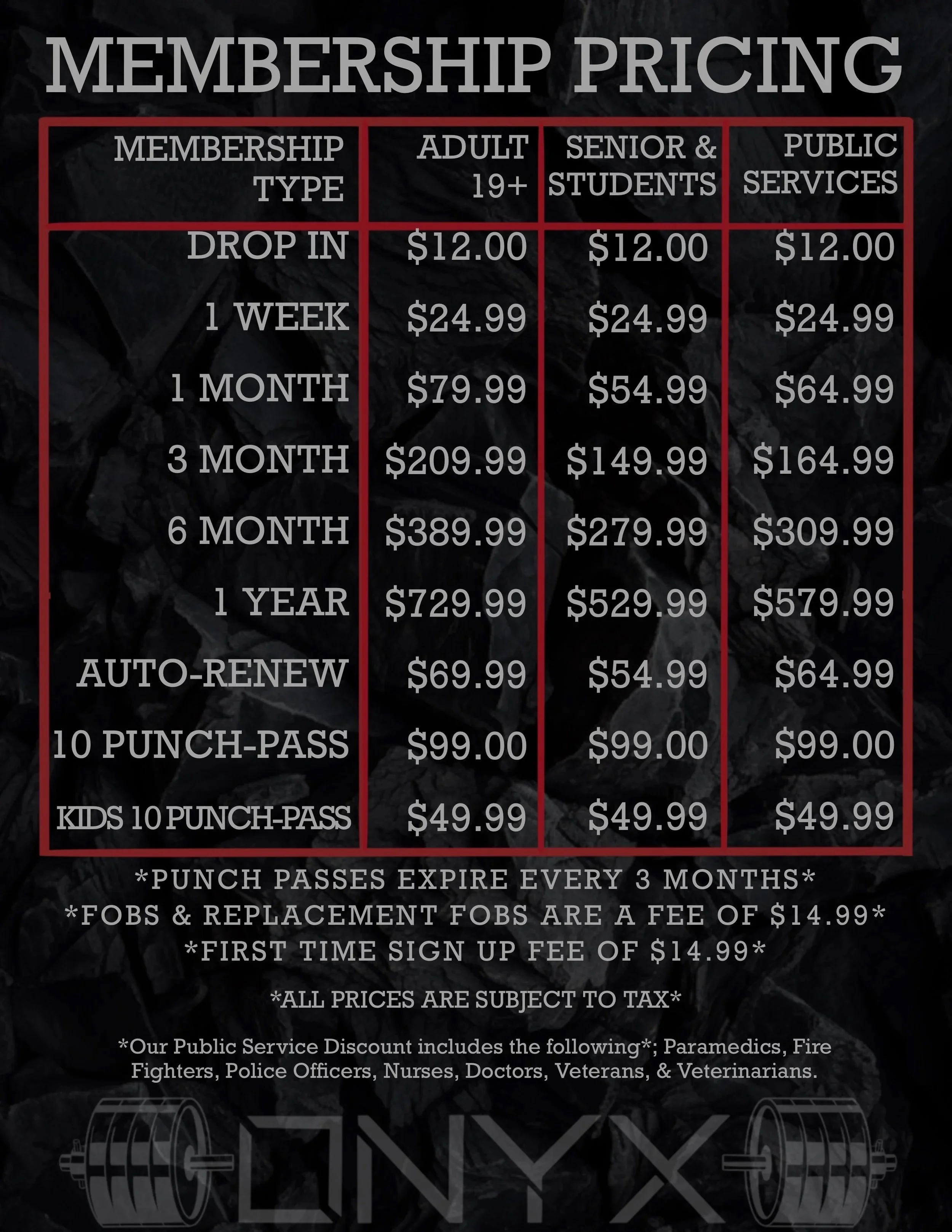 OUR SENIOR RATE IS 60+.OUR PUBLIC SERVICE INCLUDES PARAMEDICS, FIRE FIGHTERS, POLICE OFFICERS, NURSES, DOCTORS, VETERANS, & VETERINARIANS.PUNCH PASSES EXPIRE EVERY 3 MONTHS.ALL PRICES ARE SUBJECT TO PROVINCIAL TAXES.